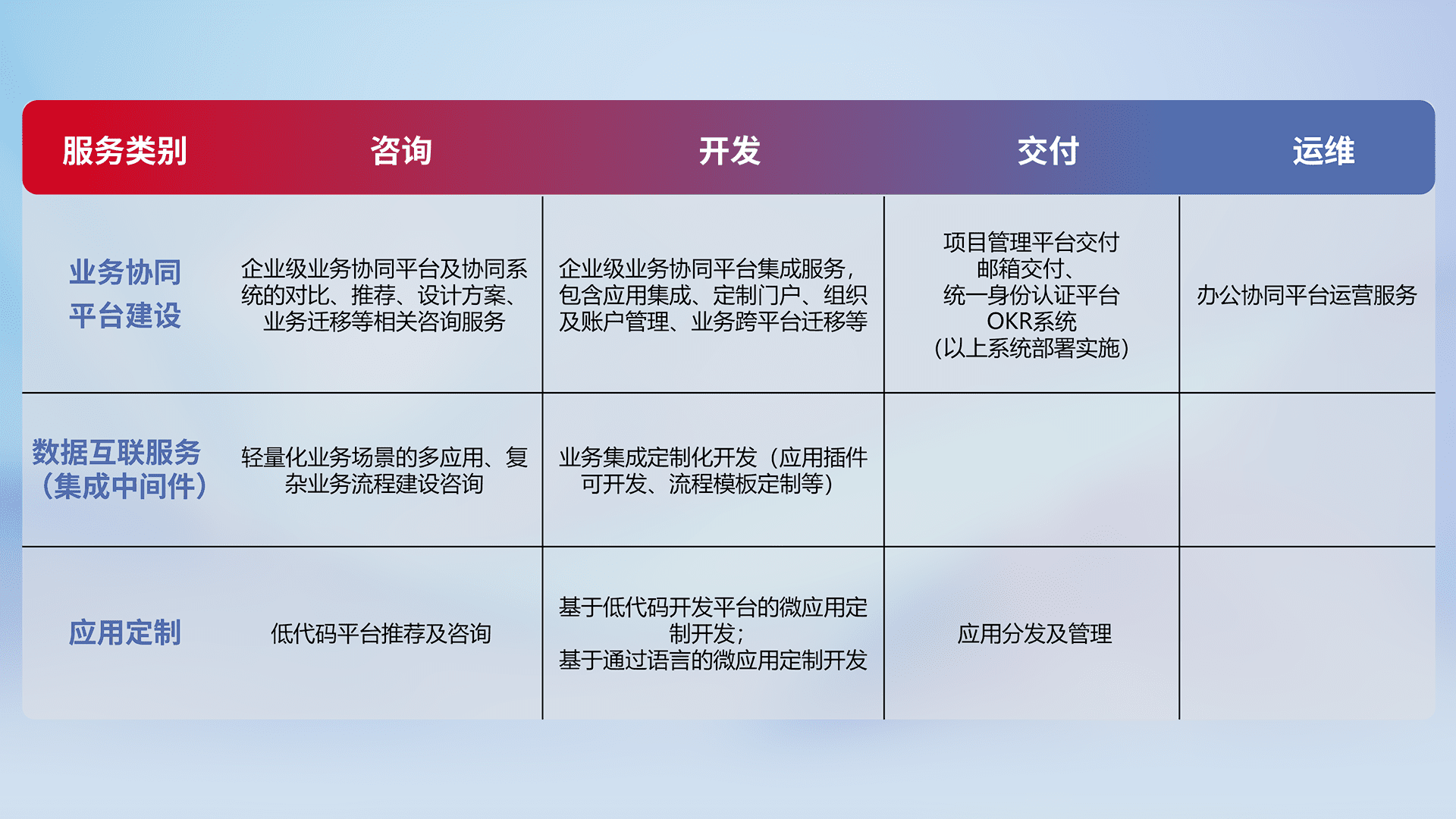 针对钉钉、、、企微、、、IDaas等平台级产品提供产品的规划、、、、方案、、交付、、、定制化开发等服务,,,,实现如统一协同办公、、智能客户服务、、、混合会议管理、、智能数据查询、、、、等业务场景,,实现数字化转型。。。。