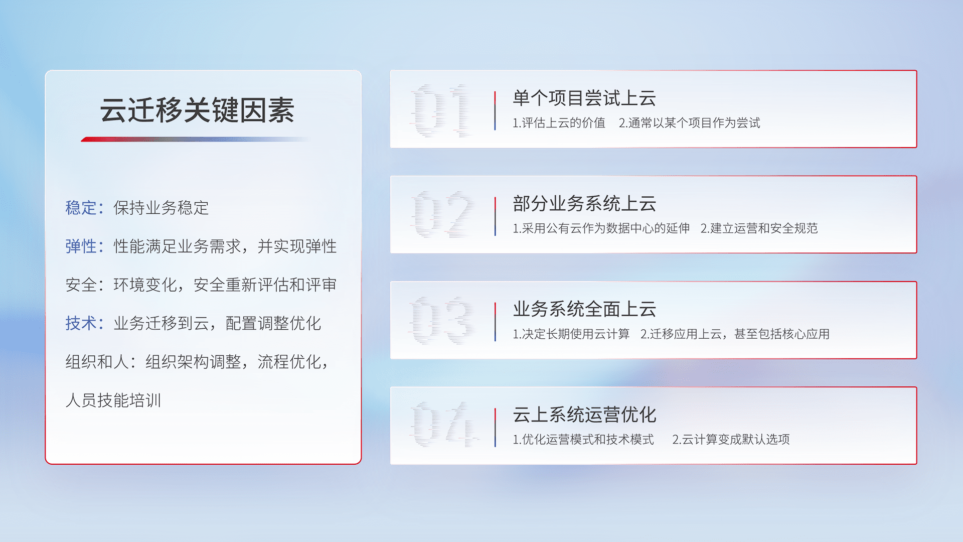 结合实际业务,,,从规划设计、、云平台选型、、云原生改造、、、、数据迁移、、、、集成交付,,,,迁移全过程为客户识别最佳上云路径,,,,做好风险识别管理,,,,设计网络架构、、、、身份权限、、、安全审计合规、、、操作审计、、、日志审计、、、、监控告警策略、、、、多站点容灾设计等,,对云上基础设施进行整体规划,,,,提升IT治理水平,,,,以满足弹性、、高可用、、高性能的需求。。