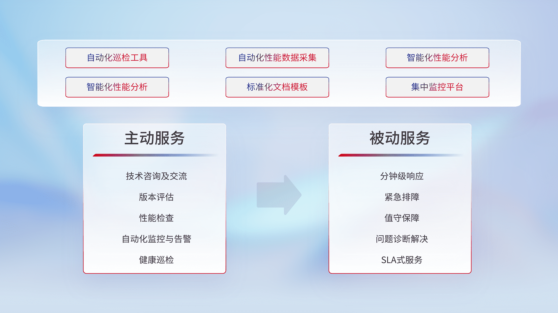 智能化工具和标准化文档,,,,保障服务质量,,,,提供主动服务(包含技术咨询、、版本评估、、性能检查、、、自动化监控与告警、、健康巡检)和被动服务包含(分钟级响应、、紧急排障、、值守保障、、、、问题诊断解决、、、SLA服务)。。。